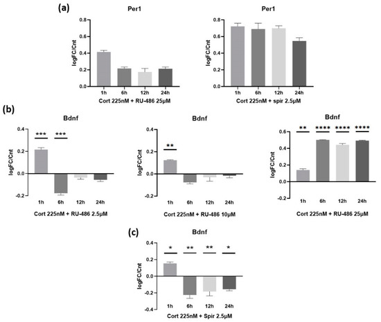 (a) The mRNA expression levels of Per1 gene were measured after the administration of RU-486 25 μM (left) and spironolactone 2.5 μM (right) along with Cort (225 nM). RU-486 markedly inhibited the expression of Per1, while spironolactone had no effect whatsoever, as expected. (b) RU-486 was able to diminish the late inhibitory effect of Cort administration in a dose-dependent manner, with higher concentrations (25 μM) even allowing for complete reversion of the effect, leading to Bdnf overexpression for up to at least 24 h. (c) The effects of spironolactone (2.5 μM) on Bdnf expression in astrocytes after Cort administration (225 nM) were evaluated on astrocytes at 4 timepoints (1 h, 6 h, 12 h, 24 h). Spironolactone did not demonstrate any significant effect on neither the early nor the late response mediated by the Cort administration. n = 3 for each experiment. * p < 0.05, ** p < 0.01, *** p < 0.001, **** p < 0.0001; one-way ANOVA. Data are mean ± S.E.M.