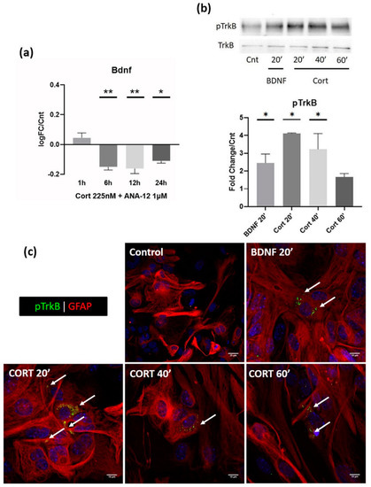 (a) ANA-12 (1 μΜ) administered simultaneously with Cort (225 nM) was able to completely abolish the Cort-mediated early response on astrocytes, restoring Bdnf expression back to its baseline control levels. At the same time, ANA-12 had no effect at all on the late response at any of the tested timepoints (6 h, 12 h and 24 h). (b) The phosphorylation of TrkB on astrocytes was measured after Cort administration (225 nM) for 20′, 40′ and 60′ with WB analysis. BDNF (500 ng/mL) administration for 20′ was used as a positive control of TrkB activation. Levels of phospho-TrkB are expressed as pTrkB/TrkB ratio normalized to the untreated control. Cort significantly increased pTrkB levels on astrocytes as early as 20′ after its administration. (c) Immunofluorescent staining of pTrkB (green) on astrocytes (GFAP, red) after Cort administration (225 nM) for 20′, 40′ and 60′ or BDNF (500 ng/mL) administration for 20′ (positive control). Phosphorylation of TrkB (arrows) was profoundly more visible both in the BDNF treatment (scale bar = 10 μm) and all the Cort treatment timepoints (scale bar = 10 μm) compared to the control condition (scale bar = 25 μm) where pTrkB stain was scarce. n = 3 for each experiment. * p < 0.05, ** p < 0.01; one-way ANOVA. Data are mean ± S.E.M.