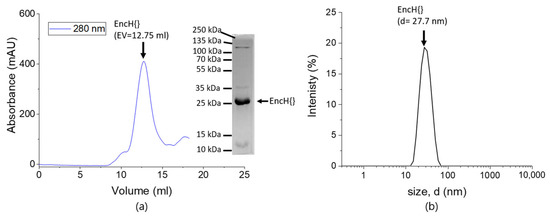 Figure 3 shows a typical size exclusion chromatogram for EncH, with the size exclusion chromatograms for the other variants given in Section S1 in Supplementary Materials. Size exclusion chromatography showed that all four variants had the expected elution volume at 12.5 mL, in agreement with the literature for an assembled cage of 24–25 nm with a Superose® 6 Increase 10/300 GL column [40]. The protein cages were also characterized in solution by using dynamic light scattering (DLS). Figure 3b show the DLS graph of EncH{} (Section S1 in Supplementary Materials shows further results). This measurement shows a narrow distribution of the cages with a hydrodynamic diameter of 27–28 nm. Such a narrow distribution indicates that there is only one type of cage present in solution with respect of the purification tag and the cargo chosen (Figure 3b and Figure S1 in Supplementary Materials). Analysis with SDS-PAGE of EncH{FLP} and EncH{sfGFP} confirms the molecular weight of the monomer of EncH{} of 30 kDa and the purity of the monomer since only a few very faint other bands are visible (see Figures S2 and S3 in Supplementary Materials).