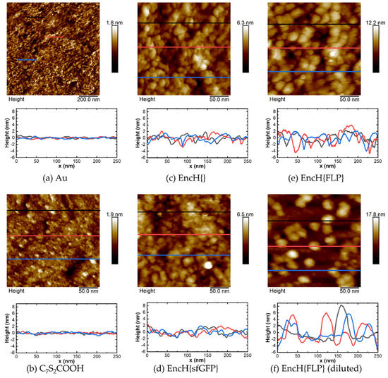 AFM images and height profiles of (a) bare Au surface and monolayers of (b) C7S2COOH, (c) EncH{}, (d) EncH{sfGFP}, and (e) EncH{FLP}. (f) AFM image of diluted SAM of EncH{FLP} showing individual proteins. The color of line in the AFM images corresponds to the color of the line plots in height profiles. Larger 1 × 1 µm images for the corresponding surfaces are shown in Supplementary Materials, Figure S4.