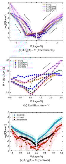We immobilized EncH with or without cargo: (i) Enc without cargo (EncH{}, Figure 1e); (ii) Enc with sfGFP protein cargo and with two different purification tags (EncH{sfGFP} and EncS{sfGFP} with 127H10 or His-tag and C-strep or Strep-tagII, respectively, shown in Figure 1f); and (iii) Enc with FLP as cargo (EncH{FLP}, Figure 1d,g). We characterized these biomolecular junctions by measuring statistically large number of current density–voltage, J(V), curves from which we determined the Gaussian log-average current densities, i.e., <log|J|>G vs. V curves at 95% confidence levels using established methods [17,54,55,57]. By using Enc with different types of cargo proteins, we demonstrate that protein-inside-proteins structures allow us to control the CT properties of the junctions because Enc and GFP are redox-inactive in contrast to FLP which is redox-active (since its biological function is to oxidize and store iron oxide). This redox activity usually enhances tunneling rates and may also lead to electronic function (such as rectification of currents or memory effects) [14,17,29,38,59].