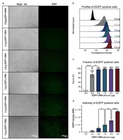 Nucleofection of HUVECs with a titration of EGFP mRNA. (a) Visualization of the EGFP positive cells by fluorescent- and bright field microscopy. (b) The profiles of EGFP-positive HUVECs at each EGFP mRNA concentration. Values are presented as normalized counts of the fluorescent intensity. (c) Fraction of EGFP-positive HUVECs at each EGFP mRNA concentration. Values are presented as the mean percentage of EGFP-positive cells SD. Neighboring EGFP mRNA concentrations are compared by one-way ANOVA with Tukey multiple comparisons test, ** p ≤ 0.01, **** p ≤ 0.0001. (d) Median fluorescence intensity of EGFP-positive cells at each EGFP mRNA concentration. Values are presented as the mean SD. Neighboring EGFP mRNA concentrations are compared by one-way ANOVA with Tukey multiple comparisons test, * p ≤ 0.05, ** p ≤ 0.01, **** p ≤ 0.0001. (a–d): Experiments on HUVECs from one biological donor at p. 5 (n = 3).