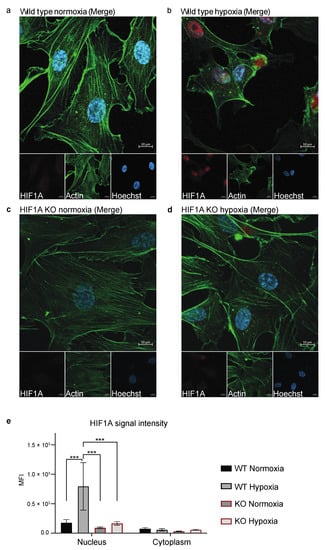 Staining of HIF1A in HIF1A KO and WT HUVECs. (a–d) One representative image of the stained HIF1A KO and WT HUVECs, which were stained with Hoechst (blue), anti-actin (green), and anti-HIF1A (red). (a) WT HUVECs cultured in normoxic conditions. (b) WT HUVECs cultured in hypoxic conditions. (c) HIF1A KO HUVECs cultured in normoxic conditions. (d) HIF1A KO HUVECs cultured in hypoxic conditions. (e) Quantification of the HIF1A signal intensity (MFI) in the nucleus and the cytoplasm in WT and KO HUVECs in normoxic and hypoxic conditions, which is compared by two-way ANOVA multiple comparisons test, *** p ≤ 0.001. The experiment was performed with one biological replicate at p. 3 (n = 3) and five images were taken per well. Scale bar 10 µm.