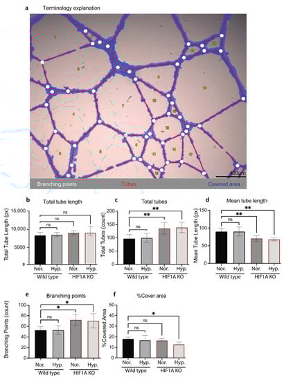 Quantification of the tube formation assay of HIF1A KO and WT HUVECs. (a) One representative bright field image of the TFA HUVECs, visualizing the Wimasis terminology which illustrates the tubes in red, the branching points in white, and the covered area in blue. Scale bar 400 µm. (b–f) Quantification of the TFA analysis of HIF1A KO and WT HUVECs cultured in normoxic conditions (Nor.) or 2 h hypoxic conditions (Hyp.). (b) The total tube length calculated in pixels. (c) The total amount of tubes, (count). (d) The mean tube length, (pixels). (e) Shows the total branching points, (count). (f) The percentage of covered area. The mean of each test ± STD is plotted, and one-way ANOVA with Tukey multiple comparisons test compared each sample group to the WT HUVECs cultured in normoxic conditions (ns = no significance, * p ≤ 0.05, and ** p ≤ 0.01). (a–f): Experiments on HUVECs from one biological donor at final p. 3.