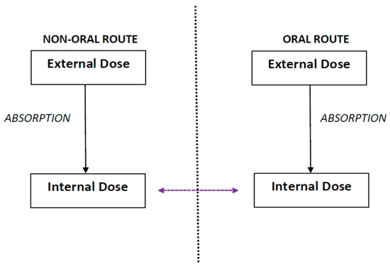 R-t-R extrapolation is defined as the extrapolation of the internal dose from one exposure route to another exposure route such that prediction of effects is based on the internal dose instead of the external dose (Figure 1) [3]. The term “external dose” refers to the dose administered in the study, whereas the term “internal dose” refers to a fraction of the administered dose or the concentration of the administered substances that is absorbed and distributed in the body through systemic circulation [7]. R-t-R extrapolation predicts the equivalent dose and dosing regimen that produces the same observed effect as that obtained for a particular dose and dosing regimen by an alternate route [1,2,4].