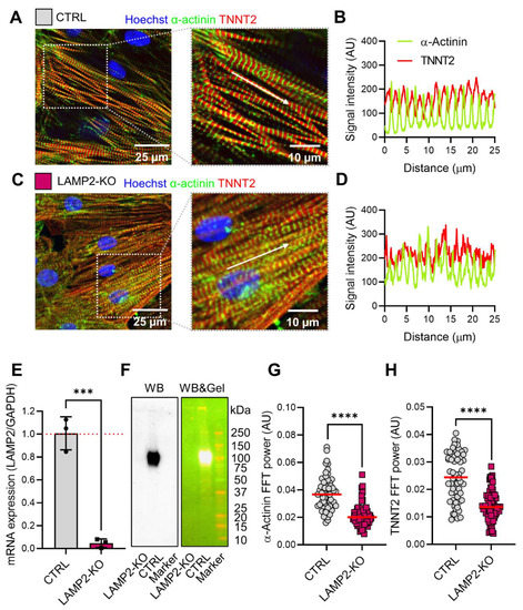 Morphological changes in LAMP2 KO iPSC-CMs. (A) Immunofluorescence staining of Ctrl iPSC-CMs with sarcomere markers (green for α-actinin and red for TNTN2) with detailed sarcomere structures shown in zoom-in view. White arrows indicate the sarcomere arrangement analyzed in detail in panel B; (B) Distribution pattern of α-actinin and TNNT2 signals along the sarcomere; (C,D) Immunofluorescence staining of sarcomere proteins in LAMP2 KO iPSC-CMs showed an irregular distribution of actinin and TNNT2 signals; € Quantification of mRNA expression of LAMP2 in both Ctrl and LAMP2 KO iPSC-CMs. Results from 3 independent experiments for Ctrl and LAMP2 KO group. Red dashed line indicates the ratio of LAMP2/GAPDH in Ctrl group was normalized to 1; (F) Western blot confirms the absence of LAMP2 protein in LAMP2 KO iPSC-CMs. Left: Western blot image; right: Western blot image merged with gel image indicates the predicted size of the target band; (G,H) Fast Fourier transformation analysis showed the regularity of α-actinin (G) and TNNT2 (H) signal distribution is significantly decreased in LAMP2 KO iPSC-CMs. N = 59 for Ctrl, N = 73 for LAMP2 KO. Data from at least 3 independent experiments. Red lines indicate the mean value of each group. *** p < 0.001, and **** p < 0.0001 versus Ctrl iPSC-CMs by unpaired t-test.
