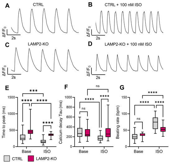 LAMP2 KO impairs β-adrenergic signaling in iPSC-CMs. (A,B) Representative Fluo-4 calcium transient trace in Ctrl iPSC-CMs before (A) and after (B) isoproterenol (ISO) treatment; (C,D) Representative Fluo-4 calcium transient trace in LAMP2 KO iPSC-CMs before (C) and after (D) ISO treatment; (E–G) LAMP2 KO iPSC-CMs exhibit prolonged transient rise ti€(E) and unchanged transient decay Tau (F) and beating rate (G) at baseline compared to Ctrl group. ISO treatment induced smaller functional improvement in LAMP2 KO groups compared to Ctrl, resulting in significant differences between Ctrl and LAMP2 KO cells. N = 59, 103, 37, and 90 cells in Ctrl, LAMP2 KO, Ctrl + ISO, and LAMP2 KO + ISO group from at least 3 independent experiments. ns: no significance, *** p < 0.001 and **** p < 0.0001 by two-way ANOVA test followed by Holm–Sidak method.