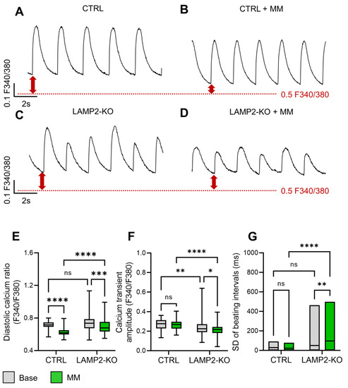 Metabolic maturation enhanced pro-arrhythmic calcium signaling in LAMP2 KO iPSC-CMs. (A,B) Representative Fura-2 calcium transient trace in Ctrl iPSC-CMs before (A) and after (B) maturation medium (MM) treatment for 48 h; (C,D) Representative Fura-2 calcium transient trace in LAMP2 KO iPSC-CMs before (C) and after (D) maturation medium (MM) treatment for 48 h. Cell were paced at 0.5 HZ in all the groups; (E–G) LAMP2 KO iPSC-CMs showed unchanged diastolic cytosol calcium level (E), slightly decreased calcium transient amplitude (F), and a trend of increased irregular beating (G) compared to Ctrl group. MM treatment significantly brought down the diastolic calcium levels in both Ctrl and LAMP2 KO iPSC-CMs, yet only induced decreased transient amplitude and increased irregular beating events in the LAMP2 KO group. N = 80, 91, 88, and 114 cells in Ctrl, LAMP2 KO, Ctrl + MM, and LAMP2 KO + MM group from at least 3 independent experiments. ns: no significance, * p < 0.05, ** p < 0.01, *** p < 0.001, and **** p < 0.0001 by two-way ANOVA followed by test Holm–Sidak method.