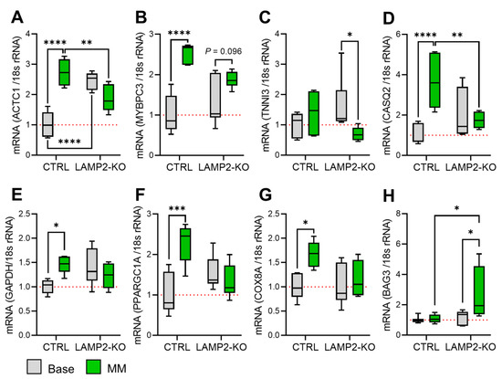 Real-time PCR quantification of mRNA expression of key cardiac genes in Ctrl and LAMP2 KO iPSC-CMs. (A,B) Increased expression of sarcomere and cytoskeletal genes ACTC1 (A) and MYBPC3 (B) genes in the Ctrl but not LAMP2 KO iCMs after MM treatment; (C) Decreased expression of adult troponin I subtype, TNNI3, in MM-treated LAMP2 KO cells; (D) Increased expression of CASQ2, which encodes Ca2+ buffering protein calsequestrin-2 in the Ctrl but not LAMP2 KO iCMs after MM treatment; (E–G) Increased mitochondrial gene expression, such as GAPDH (E), PPARGC1A (F), and COX8A1 (G) in Ctrl but not LAMP2 KO cells after MM treatment; (H) Increased expression of BAG3, a cochaperone protein of HSP70, in LAMP2 KO but not Ctrl iCMs after MM treatment. Results from at least 3 independent experiments. Red dashed line indicates the relative mRNA expression in Ctrl group at base level were normalized to 1. * p < 0.05, ** p < 0.01, *** p < 0.001, and **** p < 0.0001 by two-way ANOVA test followed by Holm–Sidak method.