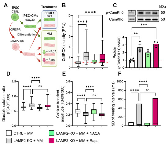 Restoration of calcium homeostasis of LAMP2 KO iCMs by ROS scavenger. (A) Diagram of experimental design. (B) Treatment of NACA but not rapamycin significantly reduced the cellular ROS overload in LAMP2 KO iCMs in MM. N = 181, 135, 145, and 143 cells in Ctrl + MM, LAMP2 KO + MM, LAMP2 KO + MM + NAC, and LAMP2 KO + MM + Rapa group from at least 3 independent experiments. (C) Western blot showed NACA reduced the p-CaMKIIδ/CaMKIIδ ratio in LAMP2 KO iCMs, but no change was detected in rapamycin treated cells. Results from at least 3 independent experiments. (D–F) Fura-2 calcium imaging analysis suggested that NACA treatment restored the diastolic calcium level (D), calcium transient amplitude (E), and regular beating (F) in LAMP2 KO iCMs, while no beneficial effect was observed in the rapamycin treated group. N = 88, 114, 105, and 98 cells in Ctrl + MM, LAMP2 KO + MM, LAMP2 KO + MM + NAC, and LAMP2 KO + MM + Rapa group from at least 3 independent experiments. Red dashed line indicates the value in Ctrl group at base level were normalized to 1. ns: no significance, ** p < 0.01, *** p < 0.001, and **** p < 0.0001 by one-way ANOVA test followed by Tukey’s test.