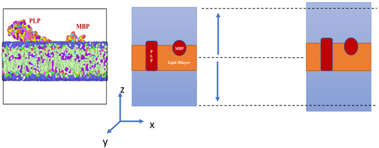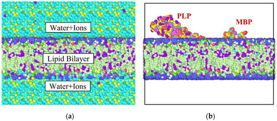 The molecular structure of myelin consists of a lipid bilayer, myelin basic protein, proteolipid protein (PLP), water and ions [40,41,42]. Accordingly, our simulation model comprised two types of protein and a lipid bilayer (Figure 1a,b). The simulation box dimensions were Å. Microscopy studies in the past [43] have revealed that the average thickness of the myelin sheath varies between 100 and 400 nm and that a single myelin layer is approximately 10 to 20 nm thick. The percentage composition of the simulation model by constituents have been tabulated in Table 1. Thus, the following dimensions were determined for the representative elements for the myelin sheath: