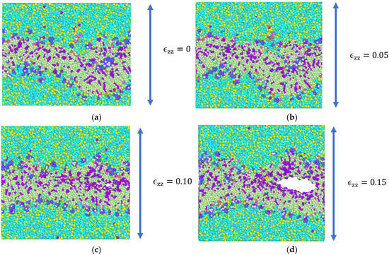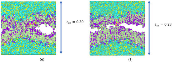 Snapshots of the simulation model taken at the end of equilibration after the application of constant tensile strain in increments (arrows indicate the application of strain along the thickness direction). (a) Equilibrated model without any strain on the system; in (b–e) 5 percent strain was applied in increment at every step; and in (f) 3 percent increment in the tensile strain resulted in final failure.