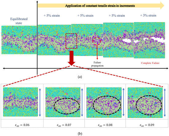 (a) Snapshots of the system from the equilibrated state to the application of constant strain in increments. (b) Snapshots of the simulation model between 5% and 10% constant tensile strain application, in increments of 1 percent.