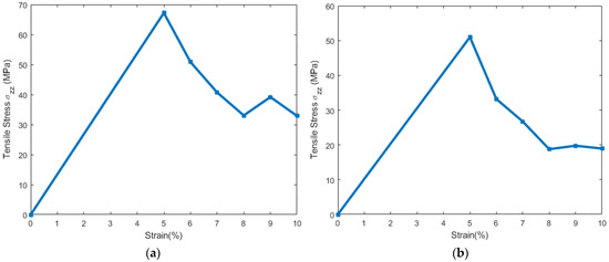 From the snapshot representation (Figure 3 and Figure 4), it can be observed that failure was initiated in the bilayer. As such, we have also estimated the average stress () developed in the bilayer with respect to the imposed incremental constant strains (Figure 5b) for the bilayer. Using the peak value of stresses, the modulus of elasticity and the Poisson’s ratio were calculated using Equations (7) and (8) and are tabulated in Table 2.
