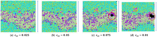 Strain application along the thickness of the model at 2.5 percent increments along the z-direction; the red circle marked shows the failure within the model.