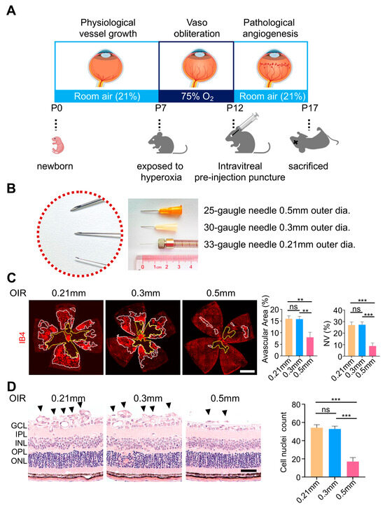 C57BL/6J mice were obtained from the Animal Center of Guangzhou University of Chinese Medicine and were housed in a specific pathogen-free facility in the Animal Laboratories of Zhongshan Ophthalmic Center. All animal experiments were approved by Institutional Animal Care and Use Committee of Zhongshan Ophthalmic Center, Sun Yat-sen University (Ethic number: Z2022042, approved on 14 June 2022). The OIR model was established as described previously [7]. Newborn mice and their nursing mothers were exposed to 75% O2 in an oxygen chamber from postnatal day 7 (P7) to P12. These mice were randomized into groups and received intravitreal puncture using needles of different calibers immediately upon returning to room air environment on P12. A disposable sharp needle (25 G with a 0.5 mm needle outer diameter, BD/30 G with a 0.3 mm needle outer diameter, BD) was inserted vertically into the eye wall 1 mm posterior to the limbus. The resulting scleral tunnel could be easily accessed for the 33 G microliter syringe injection (a 0.21 mm needle outer diameter, Hamilton). Alternatively, the 33 G microliter syringe needle could be directly inserted vertically into the eye wall. Pups weighing more than 6 g were euthanized using carbon dioxide asphyxiation on P17 for further experimental analysis.