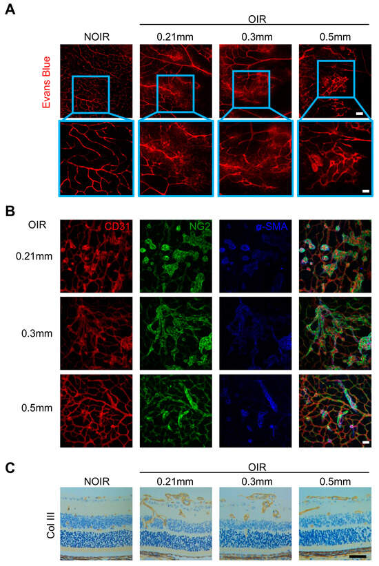 In order to further evaluate the retinal vasculature after puncture, vascular permeability was determined using Evans blue staining. As shown in the Figure 2A, the leakage of the neovascular tufts in OIR retinae was significantly alleviated by 0.5 mm puncture, while the 0.3 mm and 0.21 mm group still presented obvious vascular leakage. Both the 0.3 mm and 0.21 mm groups presented abnormal and irregular retinal vasculature with CD31+ endothelial cells and NG2+α-SMA+ mural cells. In contrast, the 0.5 mm puncture induced a significant restoration of retinal vasculature, with an organized CD31+ and NG2+α-SMA+ network (Figure 2B). Collagen staining also revealed that the 0.5 mm puncture eliminated abnormal collagen accumulation around the neovascular tufts (Figure 2C). Together, 0.5 mm puncture significantly inhibited the formation of pathological angiogenesis and improved the vasculature remodeling.