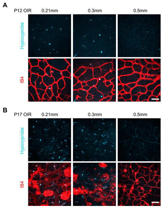 The 0.5 mm intravitreal puncture significantly alleviated hypoxia in the OIR retina. (A,B) Representative retinal whole-mount images of hypoxyprobe staining. The fluorescence intensity of the hypoxyprobe after 0.5 mm puncture significantly decreased on P12 (A) and P17 (B) compared with that after 0.3 mm puncture and 0.21 mm puncture. Scale bars: 50 µm.
