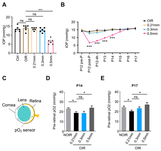 The 0.5 mm puncture induced a substantial reduction in intraocular pressure (IOP) and an improvement in retinal oxygen partial pressure (pO2). (A) The 0.5 mm puncture on P12 significantly reduced IOP, while 0.3 mm puncture made no significant changes to IOP (n = 6 eyes, ns, no significance; *** p < 0.001). (B) Dynamic changes in IOP during P12 to P17. After 0.5 mm puncture on P12, IOP was sharply decreased and sustained a relative lower level until P14 compared with 0.3 mm puncture and 0.21 mm puncture in the OIR model (n = 6 eyes, *** p < 0.001). (C) Schematic showing the pO2 measurement in the epiretinal space of mice. After 0.5 mm puncture, the pO2 significantly increased at P14 (D) and P17 (E) (n = 6 eyes, ns, no significance; * p < 0.05).
