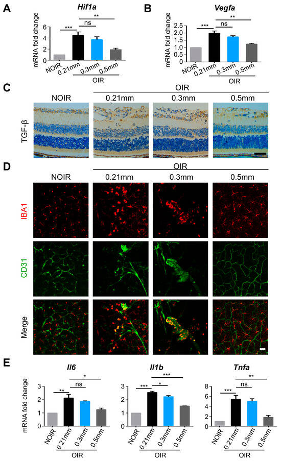 The 0.5 mm puncture suppressed the expressions of Hif1a and relevant angiogenic-inflammatory genes in retina. (A,B) Hif1a and Vegfa were increased in the OIR retina, which were abrogated by 0.5 mm puncture (n = 6 retinae, ns, no significance; ** p < 0.01; *** p < 0.001). (C) The protein level of TGF-β was significantly reduced after 0.5 mm puncture. Scale bars: 50 µm. (D) The IBA1+ microglia were activated and recruited to perivascular locations in OIR retinae with 0.21 mm and 0.3 mm punctures, which were restored after 0.5 mm puncture. Scale bars: 50 µm. (E) The mRNA expressions of Il6, Il1b, and Tnfa were decreased by 0.5 mm puncture (n = 6 retinae, ns, no significance; * p < 0.05; ** p < 0.01; *** p < 0.001).