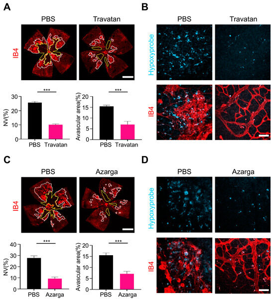 Finally, we evaluated the anti-angiogenic effects of lowering IOP drugs, to further confirm the relationship between IOP and angiogenesis. Travatan, a commonly used Prostaglandin analogue (PGAs) drug containing 0.004% travoprost, and Azarga, another combination medication containing brinzolamide and timolol maleate, were used. Both Travatan and Azarga reduced the IOP as early as 2 h after treatment and maintained the effect for 5 days (Figure S2A,B). Remarkably, five-day usage of Travatan could suppress the pathological neovascularization to an extent to 60% (Figure 6A). In addition, the avascular area was also significantly reduced in the IB4-staining wholemounts (Figure 6A), and the hypoxyprobe results showed an obvious reduction in retinal hypoxia after Travatan usage (Figure 6B), indicating the close relationship between retinal hypoxia relief and IOP reduction. Similarly, Azarga could also alleviate the hypoxia with reduced avascular area and less hypoxyprobe signaling, leading to angiogenesis area inhibition by about 60% (Figure 6C,D). Together, the IOP-lowering drugs could alleviate retinal hypoxia and further suppress retinal neovascularization.