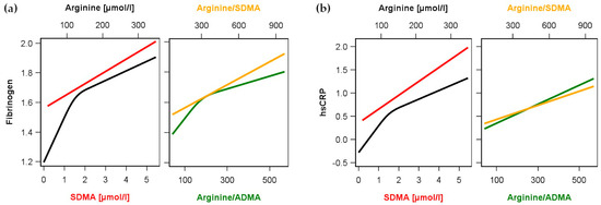 Association between arginine (black) or symmetric dimethylarginine (SDMA, red) as well as the ratios arginine/ADMA (green) and arginine/SDMA (orange) and (a) levels of fibrinogen or (b) high-sensitivity C-reactive protein (hsCRP) in the whole study population. Linear regression models without or with restricted cubic splines (see methods and Table 2) were adjusted for age, sex, waist circumference, smoking, total cholesterol, diabetes and hypertension.