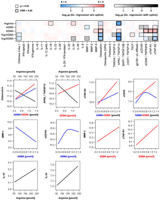 Associations between arginine, asymmetric (ADMA) or symmetric (SDMA) dimethylarginine as well as ratios and levels of measured cytokines and inflammatory biomarkers in the subpopulation. Upper part: Color-coded p-value from linear regression models without or with restricted cubic splines (see methods and Table S1) adjusted for age, sex, waist circumference, smoking, total cholesterol and hypertension. Significant associations with p-values or corrected p-values (controlling the false discovery rate (FDR)) < 0.05) are marked with a black box. Lower part: Regression lines for significant associations (black—arginine; red—SDMA; blue—ADMA). Regression lines for significant ratios are given in Figure S1.