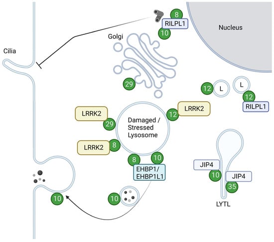 Localizations and functions of LRRK2-phosphorylated Rabs. Green circles with numbers indicate Rabs phosphorylated by LRRK2. LRRK2-phosphorylated Rab12 and Rab29 are recruited to damaged or stressed lysosomes and further activate LRRK2. LRRK2-phosphorylated Rab8 and Rab10, bound to their effector RILPL1, accumulate near centrosomes to inhibit ciliogenesis. Rab8 and Rab10 also act together with their effector EHBP1 or EHBP1L1 to counteract lysosomal inflation or facilitate lysosomal release. LRRK2-phosphorylated Rab10 and Rab35 bind to JIP4 and induce LYTL. LRRK2-phosphorylated Rab12 binds to RILPL1 and moves lysosomes to the perinuclear region. LRRK2-phosphorylated Rab29 alters the morphology of the trans-Golgi. L: Lysosomes. Figure created with BioRender.com.