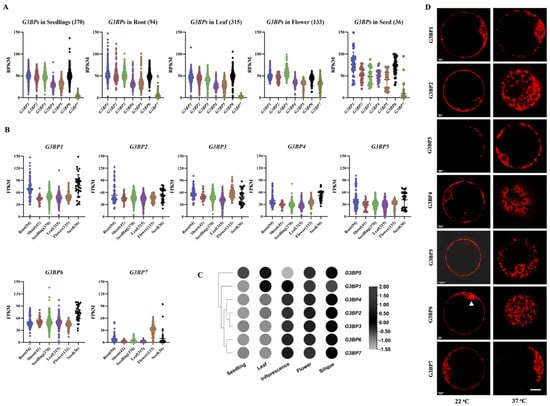 Previous studies have suggested functional similarities between human and Arabidopsis G3BPs [,]. To gain insights into the expression patterns of G3BPs in Arabidopsis, we analyzed the RNA-seq data from the intergraded Arabidopsis RNA-seq Database (http://ipf.sustech.edu.cn/pub/athrna/, accessed on 2 July 2022). The results showed that most G3BP genes manifested ubiquitous expression in all selected tissues or organs, except for G3BP7, which was exclusively expressed in flowers (Figure 1A,B). Higher expressions of most G3BPs in flowers were further verified with the qRT-PCR assay (Figure 1C and Figure S1). Although it has been reported that most plant G3BPs show similar subcellular localization in cells [], the resolution of the cellular localization of G3BPs is still low in plant cells. In the present study, we expressed individual G3BP genes in Arabidopsis protoplasts and analyzed the details of the subcellular localization of the G3BPs in a single cell. Transient expression analysis revealed that most G3BPs presented in the cytoplasm, except that G3BP6 was additionally found in the nucleus (Figure 1D). It has been reported that all plant G3BPs promote SG formation []. We investigated if the transient expressions of different G3BPs in tobacco mesophyll cells would induce SG formation under heat shock stress. Indeed, the expressions of all the tested G3BPs in Arabidopsis protoplasts resulted in notable SG-like structures (Figure 1D). Additionally, it is interesting to note that both G3BP3 and G3BP7 had already formed SG-like structures under ambient conditions (Figure 1D).
