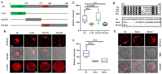 The NTF2-like domain has been suggested to play a role in the nuclear shuttling of G3BP [,,]. Although the NTF2-like domain is present in all Arabidopsis G3BP homologues, previous studies and our own have indicated that only G3BP6 displays both cytoplasm and nuclear localization (Figure 1D). Here, we have further explored the roles of the NTF2-like domain in determining the nuclear localization of Arabidopsis G3BP6 by analyzing the subcellular localizations of various truncated G3BP6 fragments (Figure 2A). The results showed that all the truncated G3BP6 fragments, either with or without the NTF2-like domain, were still detected in the nucleus (Figure 2B). Moreover, the nuclear signal intensities of the two truncated G3BP6 fragments, one with the NTF2-like domain (1–134 aa) and one without the NTF2-like domain (276–453aa), transiently expressed in the Arabidopsis protoplasts were much lower than that of the full length (FL) or the truncated G3BP6 fragment (135–275 aa) (Figure 2B,C). This indicates that the expression of G3BP6 in the nucleus was not related to the NTF2-like domain. We then investigated whether the potential nuclear localization signal (NLS) was presented in the 135–275 aa sequence of G3BP6 using online NLS prediction software NLStradamus (Revision r.9 - Last Updated on: March 25 2020) []. The bioinformatic analysis showed the potential NLS in G3BP6 from numbers 241 to 256 of the amino acid sequence (KRKPVEKPVAAPERKA), which is relatively well-conserved in plant species such as Capsella, Eutrema and Brassica (Figure 2D). To evaluate the potential contribution of the NLS to the nuclear localization of G3BP6, two truncated versions of G3BP6 with the integrity of the NLS disrupted were designed for further analysis. It was revealed that the nuclear accumulation of G3BP6 was significantly decreased with the NLS sequence disrupted (Figure 2D–F). However, the nuclear localization of the G3BP6 was not completely abolished even when the assigned NLS was deleted, implying the involvement of other relevant factors in the nuclear shuttling of G3BP6.