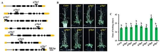 Characterizations of the g3bp mutants. (A) Schematic representation of the locations of the T-DNA insertions within the G3BP genes. Exons and introns are indicated with black boxes and lines, respectively, and the UTR region is indicated in yellow. White triangles denote the sites of T-DNA insertion. (B) Phenotypic analysis of wild-type and g3bp mutant plants grown under LD conditions for eight weeks. (C) Quantifications of the blotting time for wild-type Col-0 and g3bp mutants from (B). Three biological replications were performed and similar results were observed. The lowercase letters denote statistically significant differences between the indicated samples, as determined with one-way ANOVA (p < 0.05). Error bars are indicated as means ± SE (n = 12).