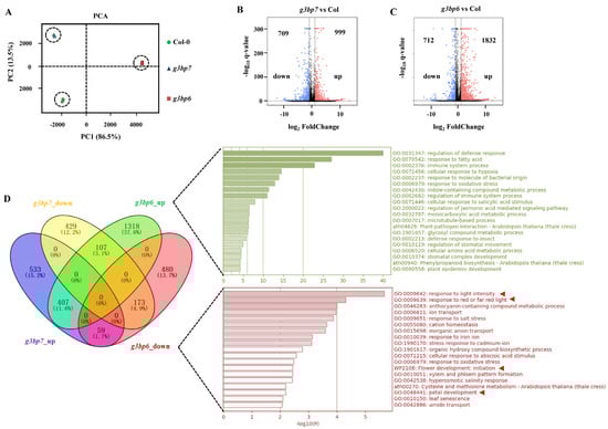 RNA-sequencing analysis of differential gene expression among Col-0, g3bp6 and g3bp7. (A) PCA plot of RNA-seq data from Col-0 (circle), g3bp6 (square) and g3bp7 (triangle) samples. Each dot represents one sample; % variability encompassed within each principal component is shown. (B,C) Volcano plots of all genes showing differential expression. Pink and blue dots denote significant upregulation and downregulation, respectively. Blue dots indicate a decrease in value, pink indicates an increase, black indicates no change. (D) Gene ontology (GO) analysis of the most significantly enriched GO terms in the biological process from DEGs uniquely found in g3bp6 based on comparison to the Venn diagram.
