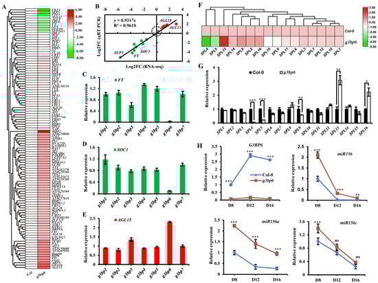 To further evaluate the role of G3BP6 in the regulation of the Arabidopsis flowering transition, we first analyzed the expression patterns of flowering-related genes from Col-0 and the g3bp6 mutant. The results showed that, in a total of 109 selected floral genes, 18 of them were upregulated and 54 were downregulated in the g3bp6 mutant (Figure 5A). We further randomly selected 20 DEGs and quantified their expression with qRT-PCR. The results were consistent with the RNA-sequencing analysis, with all the tested DEGs exhibiting similar trends (Figure 5B), implying the reliability of the RNA-sequencing data. Among these genes, the floral integrator FLOWERING LOCUS T (FT) and SUPPRESSOR OF CONSTANS 1 (SOC1) are the major targets of multiple flowering pathways [,,]. Consistently, FT and SOC1 were significantly downregulated in the g3bp6 mutant as compared to either Col-0 or to any other g3bp mutant (Figure 5C,D). Furthermore, we found that two MADS-domain proteins, AGAMOUS-LIKE15 (AGL15) and AGL18, which act as floral repressors [,], were remarkably upregulated, accompanied by G3BP6 mutation (Figure 5A,E). Notably, the expression of several SQUAMOSA PROMOTER BINDING-LIKE (SPL) genes, which are involved in the control of flowering [,], were significantly altered in the g3bp6 mutant as compared with those of Col-0 (Figure 5F). Specifically, the transcript levels of SPL4, SPL5 and SPL9 were substantially decreased in the g3bp6 mutant in comparison with those in Col-0 (Figure 5G). Additionally, as SPL4 and SPL5 are also post-transcriptionally regulated by microRNA156 (miR156) during shoot development [], we tested whether G3BP6 regulates SPL expression by modulating amounts of miR156. We used qRT-PCR to examine the levels of miR156 in the shoot apices of the Col-0 and g3bp6 plants at 8, 12 and 16 d after planting. The results showed that the expression levels of the miR156 were decreased in Col-0 during shoot development and the g3bp6 mutant had elevated levels of pri-miR156a at each of these time points (Figure 5H). Pri-miR156a and pri-miR156c are the two major sources of mature miR156 for the juvenile-to-adult vegetative phase transition [,,]. We further examined the transcription of miR156a/miR156c and found that only pri-miR156a was significantly elevated in g3bp6. Additionally, the G3BP6 itself was also significantly elevated during shoot development (Figure 5H). Collectively, these results suggest that G3BP6 probably represses the level of miR156 by controlling the transcription of miR156a, thus regulating downstream targets like SPL proteins during the flowering transition.