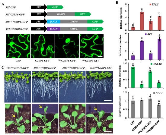 To testify if the nuclear localization of G3BP6 is important to its function in the flowering transition, we manually changed its subcellular localization by attaching the signal peptides of the NLS and the nuclear export signal (NES) directly to G3BP6 (as NLSG3BP6 and NESG3BP6, respectively) and transiently expressed them in N. benthamiana (Figure 6A). The results revealed that the NESG3BP6-GFP was localized in the cytoplasm, whereas the NLSG3BP6-GFP was mainly localized in the nuclei in leaf epidermal cells. We then compared the effects of the two differently localized G3BP6 variants on the expressions of SPL5, AP2 and AGL18 in Arabidopsis protoplasts. The results showed that the expression of SPL5 was remarkably enhanced when the G3BP-GFP was overexpressed (Figure 6B). Notably, the expression of SPL5 was much higher in cells overexpressing NLSG3BP6-GFP in comparison with that in cells overexpressing NESG3BP6-GFP (Figure 6B). A similar trend was found for the expression of AP2 (Figure 6B). In contrast, the G3BP6-GFP and NLSG3BP6-GFP cells displayed notably repressed AGL18 expression (Figure 6B). To further investigate the role of the nuclear pool of G3BP6 in flowering, we generated transgenic plants overexpressing G3BP6-GFP, NESG3BP6-GFP and NLSG3BP6-GFP on a Col-0 background. In the seedling stage, the plants with G3BP6 and NLSG3BP6 overexpression were similar to that of Col-0 (Figure 6C, upper panel). Unexpectedly, the overexpression of NESG3BP6 led to severe growth defects, such as short root growth. Bolting is an important developmental stage of plants from vegetative growth transit to reproductive growth []. We observed that plants with overexpressions of both G3BP6-GFP and NLSG3BP6-GFP bolted much earlier than plants with overexpression of NESG3BP6-GFP (Figure 6C, lower panel). This indicates that the expression of G3BP6 in the nucleus is essential for its role in the flowering transition.