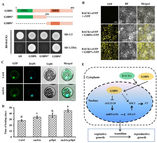 Given that the interaction between RACK1 and G3BP6 occurred both in the cytoplasm and in the nucleus (Figure 7B), we assumed that RACK1 was involved in the nuclear translocation of G3BP6. To test this possibility, we examined the subcellular localization of G3BP6 in Col-0 and the rack1a mutant. When expressed in Col-0, G3BP6 was widely distributed in the cytoplasm and nucleus (Figure 7C). However, the nuclear localization of the G3BP6 was significantly decreased in the protoplasts of the rack1a mutant (Figure 7C). Previous phenotypic analysis has demonstrated that the loss-of-function mutant rack1a has late flowering [], which is very similar to the delayed-flowering phenotype in g3bp6. We further found additional effects on late flowering in the rack1a g3bp6 double mutant (Figure 7D). This implies that RACK1 may interact with G3BP6 to regulate the flowering transition.