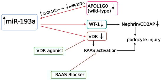 Effects of miR-193a on target messenger RNAs and its impact on podocytes [,,]; miR-193a inhibits APOL1G0 [,,]; miR-193a downregulates WT-1 [] and VDR [,]. Attenuation of WT1 results in the downregulation of the expression of podocyte proteins (nephrin and CD2AP), which form adherens junction complexes and decreased expression of VDR, resulting in compromised heterodimerization of VDR with RXR [] and activation of the RAAS []; RAAS blockers such as losartan increase VDR []. RAAS: renin-angiotensin-aldosterone system, VDR: vitamin D receptor, RXR: retinoid X receptor, APOL1G0: apolipoprotein wild-type.