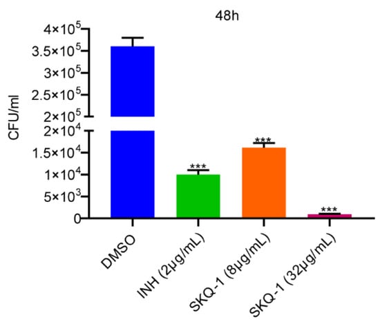 The effect of SKQ-1 on intracellular Mtb was examined through the THP-1 macrophage infection model. Macrophages were incubated with RPMI-1640 medium supplemented with 2% FBS containing 8 μg/mL or 32 μg/mL SKQ-1 until 48 h post-infection. A group cultured with a medium supplemented with DMSO served as a negative control, and a group cultured with a medium with a final concentration of 2 μg/mL INH served as a positive control. At 48 h post-infection, the cells were lysed, and CFU assays were performed to determine the number of viable intracellular bacteria. The bactericidal effect of INH on intracellular H37Rv was consistent with that in previous reports. The effects of 8 μg/mL SKQ-1 and 2 μg/mL INH were similar, and the clearance of H37Rv in macrophages was enhanced with the increase in SKQ-1 concentration. Compared with the negative control group, the group of SKQ-1 at 32 μg/mL exhibited a reduction in intracellular bacteria by 360 times (Figure 2). The above results indicate that SKQ-1 can kill H37Rv in macrophages.