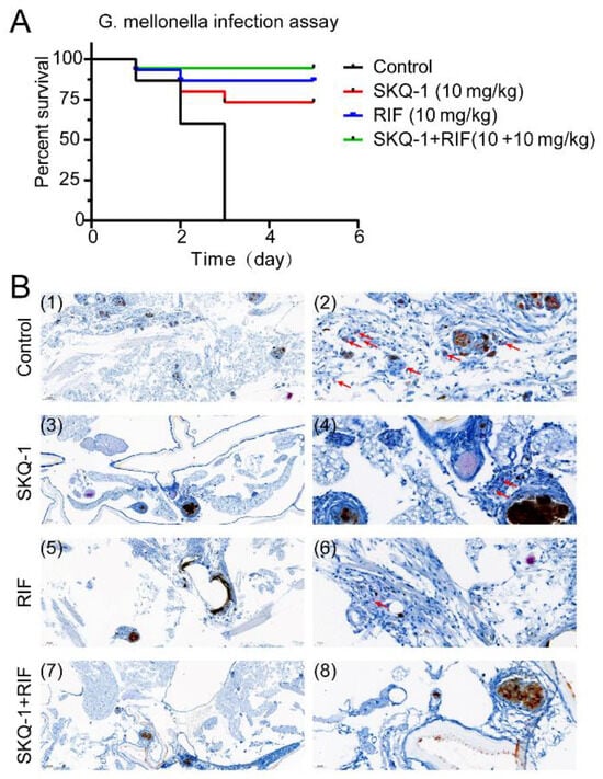Combined effects of SKQ-1 and rifampicin (RIF) in a G. mellonella larvae infection assay. G. mellonella larvae (n = 15 per group) were infected with H37Rv (5 × 106 CFU). G. mellonella larvae were then treated with SKQ-1 (10 mg/kg) or RIF (10 mg/kg) alone or in combination (10 + 10 mg/kg). (A) Survival rates of the G. mellonella larvae. (B) Acid-fast staining of H37Rv in the G. mellonella larvae. The scale bars in images (1), (3), (5), and (7) represent 100 μm; the scale bars in images (2), (4), (6), and (8) represent 20 µm. Red arrow points to bacteria.