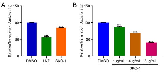 To confirm the effect of SKQ-1 on protein synthesis, we performed a coupled transcription/translation analysis. DMSO and 0.5 μg/mL LNZ were added to the reaction systems as a negative control and positive control, respectively. We detected the inhibitory effect of 2 μg/mL SKQ-1 on translation. The results showed that LNZ significantly inhibits protein translation, which was consistent with the findings of previous studies, and SKQ-1 exhibited the same effect as that of LNZ (Figure 4A). Subsequently, we measured the inhibition of translation after treatment with different concentrations of SKQ-1 (1 μg/mL, 4 μg/mL, and 8 μg/mL), and the results showed that the inhibition of protein synthesis was enhanced as the concentration increased. It was also found that 8 μg/mL SKQ-1 was able to reduce the translation activity to 40% (Figure 4B).