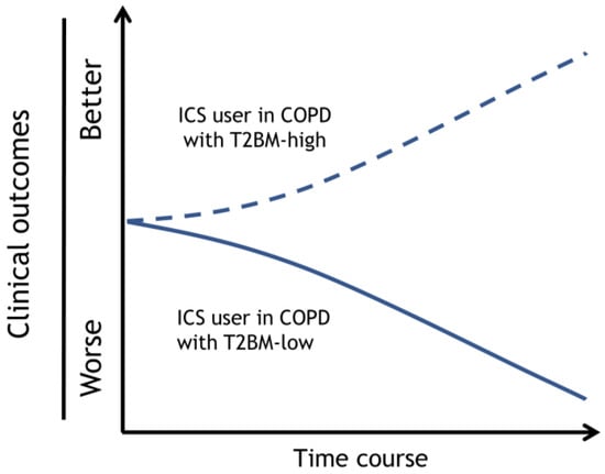 Prognosis of an ICS user with COPD with type 2 biomarker-high or -low. The clinical outcomes of the ICS user in COPD with T2BM-high can be improved, and T2BM-low exacerbated. Dotted and solid lines depict the time course of clinical outcomes, such as symptoms, pulmonary function decline, and exacerbations, by each strategy. Dotted lines; ICS user with COPD with T2BM-high, Solid lines; ICS user with COPD with T2BM-low. Adapted with permission from Ref. []. Copyright 2023 Japanese Society of Internal Medicine. Abbreviations: ICS, inhaled corticosteroid; COPD, chronic obstructive pulmonary disease; T2BM, type 2 biomarker.