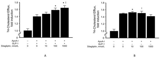 Effect of sitagliptin in the presence (A) or absence (B) of GLP-1 (10 nmol/L) on apoA1-mediated cholesterol efflux. Values represent mean ± SD. * p < 0.01; † p < 0.05 vs. apoA-I (–), ‡ p < 0.05 vs. apoA1 + GLP-1. Each group, n = 5–6.