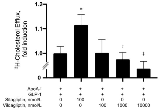 Effect of sitagliptin and vildagliptin in the presence of GLP-1 (10 nmol/L) on apoA1-mediated cholesterol efflux. Values represent mean ± SD. * p < 0.05 vs. apoA-I + GLP-1, † p < 0.05; ‡ p < 0.01 vs. sitagliptin (100 nmol/L). Each group, n = 4–8.