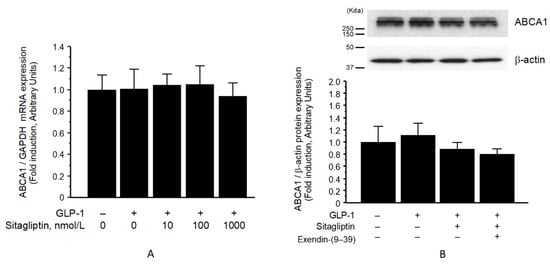 In contrast, the ABCA1 mRNA expression was not significantly increased following treatment with sitagliptin phosphate in the presence of GLP-1 (Figure 3A). Furthermore, sitagliptin phosphate did not affect the whole-cell expression of ABCA1 protein (Figure 3B).
