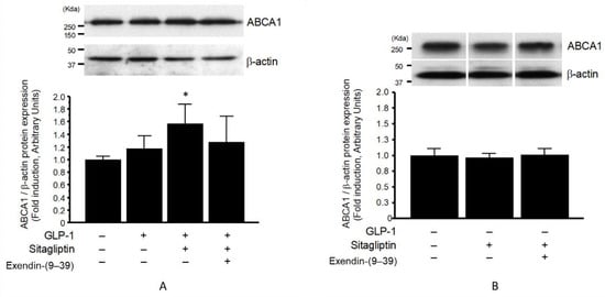 Interestingly, the ABCA1 protein expression was significantly elevated in the membrane fraction by sitagliptin phosphate in the presence of GLP-1 (Figure 4A), but not in its absence (Figure 4B). The elevated ABCA1 protein expression due to sitagliptin phosphate in the membrane fraction was slightly decreased following preincubation with the GLP-1R antagonist exendin-(9–39); however, this result was not statistically significant (Figure 4A).