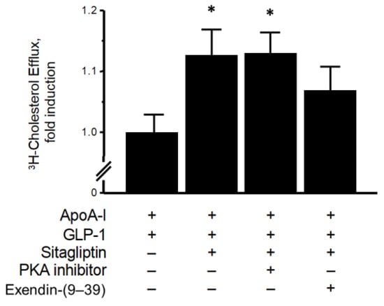 PKA was reported to accelerate the phosphorylation of the ABCA1 protein, promoting an apoA1-mediated cellular cholesterol efflux []. As is shown in Figure 5, a PKA inhibitor did not completely suppress the elevation of the apoA1-mediated cholesterol efflux by sitagliptin phosphate in the presence of GLP-1. However, a significant increase in apoA1-mediated cholesterol efflux due to sitagliptin phosphate was noted which, although not completely inhibited, was partially inhibited by preincubation with the GLP-1R antagonist exendin-(9–39), showing a similar tendency to that of the ABCA1 protein in the membrane fraction.
