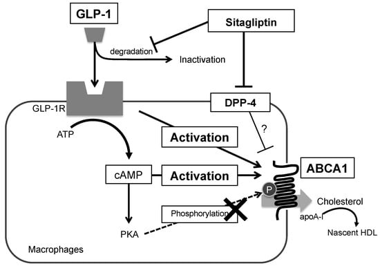 To our knowledge, the present study is the first to demonstrate that sitagliptin—but not vildagliptin—can elevate an apoA1-mediated cholesterol efflux in cultivated THP-1-derived macrophages, as is summarized in Figure 6. The induction of an apoA1-mediated cholesterol efflux does not only reflects cholesterol removal from macrophage foam cells; it is also an important initial step in the RCT process. This increases the de novo synthesis of nascent HDL or pre-β-HDL particles and leads to enhanced HDL function []. These effects of sitagliptin were observed in the presence, but not absence, of GLP-1, and were abolished by a GLP-1R antagonist, although not completely (Figure 5). A similar tendency was noted regarding the ABCA1 protein levels in the membrane fraction, as is shown in Figure 4A. These observations may indicate that sitagliptin phosphate can directly affect cholesterol efflux, suggesting that it upregulates apoA1-mediated cholesterol efflux via GLP-1R and that there may be additional direct pathways in macrophages.