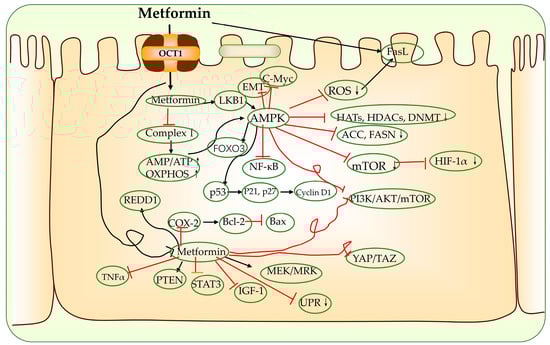 - Suppression of Hippo pathway expression [,]: In some (cancer) models, metformin has been shown to repress the activity or expression of yes-associated protein (YAP)/tea domain transcription factor (TAZ), which are two central effectors of the Hippo pathway that are mediated by AMPK [,,,,,];