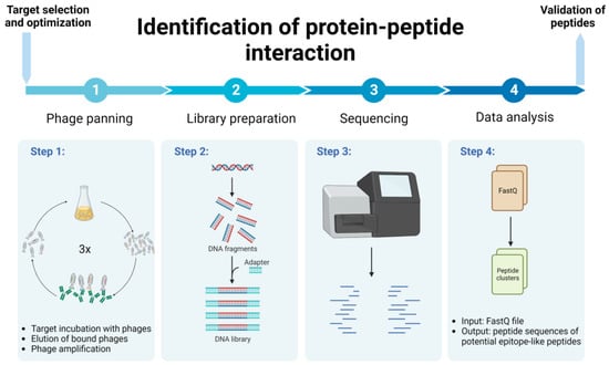 This study presents the methodology for identifying protein–peptide interaction, using a relatively fast, cost-efficient and less labor-intensive protocol, implementing phage biopanning and NGS followed by bioinformatic analysis (Figure 1 and Figure 2). We used the Ph.D. commercial system, which is based on a filamentous M13 phage vector that works as a physical linkage between each variant of a protein sequence and the DNA encoding it []. The pipeline for efficient identification of peptide binding partners using various computational tools for detailed data analysis is presented. As an example of the application of this protocol, we present the identification of immunologically relevant allergen Ves v 5 epitopes.