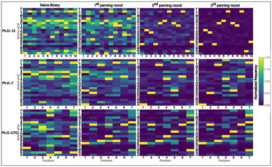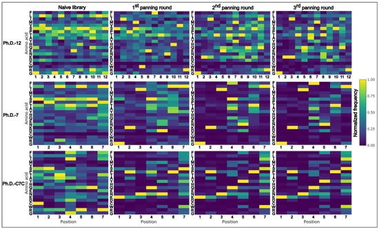 When examining the amino acid composition of the libraries, and how it changes through panning rounds, an apparent reduction of amino acid diversity with each consecutive panning round can be observed (Figure 3). Certain amino acids become underrepresented during the selection process, while others appear overrepresented (Figure 3). Strong positional overabundance of specific amino acids can be seen in panning rounds of Ph.D.-12. Moreover, even in amplified naïve libraries, without selection pressure, the amino acid composition is affected by the amplification bias.