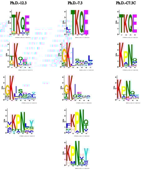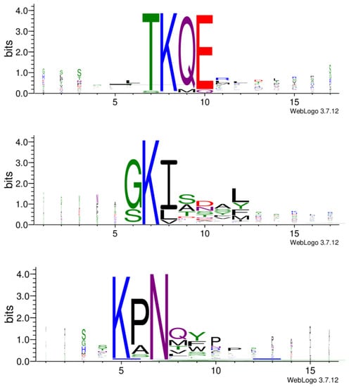 In further analysis, all the cleaned data from the three libraries were combined, and the resulting 525 peptides were subjected to the Hammock tool [], which produced three clusters of the most similar peptides (Supplementary Table S2). WebLogo [] created the logos of sequences in each cluster (Figure 6). The generated clusters were based on the same motifs we observed before with the MEME Suite. In the KPN motif, proline can be substituted with alanine or, less frequently, with serine. In position 8 (after asparagine), an amino acid with a polar side chain (glutamine or threonine) or non-polar side chain (methionine, valine or leucine) appears. This is then followed by an aromatic amino acid (tyrosine, phenylalanine or tryptophan). Motif GKI almost exclusively appears at the beginning of the sequence. Glycine may be substituted with serine, and isoleucine with leucine or valine. Serine is also often present in positions 9 to 11. Position 12 may be occupied with non-polar leucine or methionine, or aromatic tyrosine or phenylalanine. Amino acids in motif TKQE appear rather dominant without other possible sequence variations (Figure 6).
